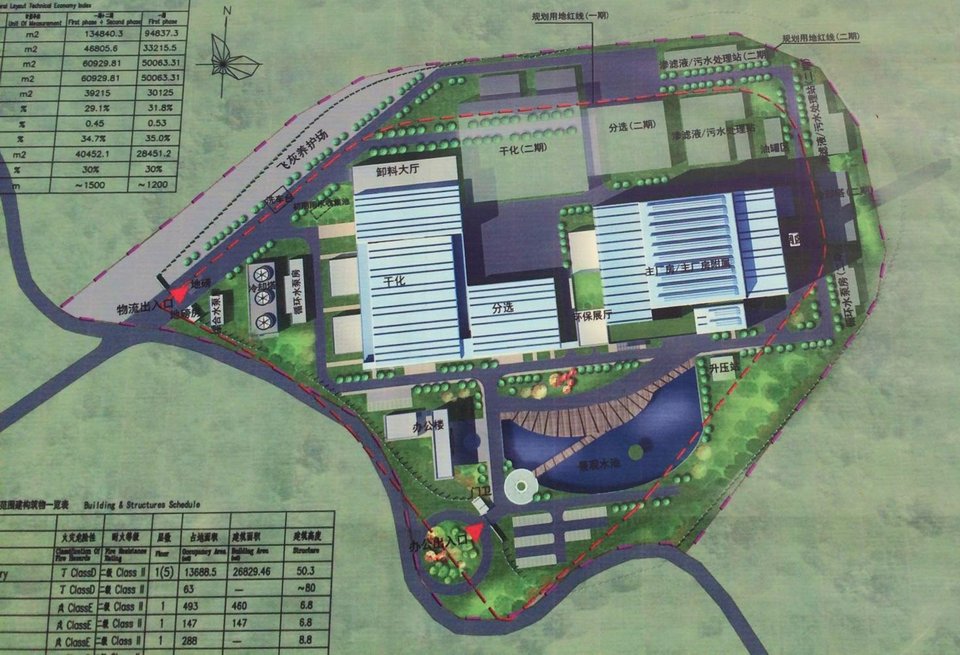 处理工艺:原生垃圾→垃圾池→垃圾破碎→生物干化→机械分选→垃圾燃料→焚烧发电